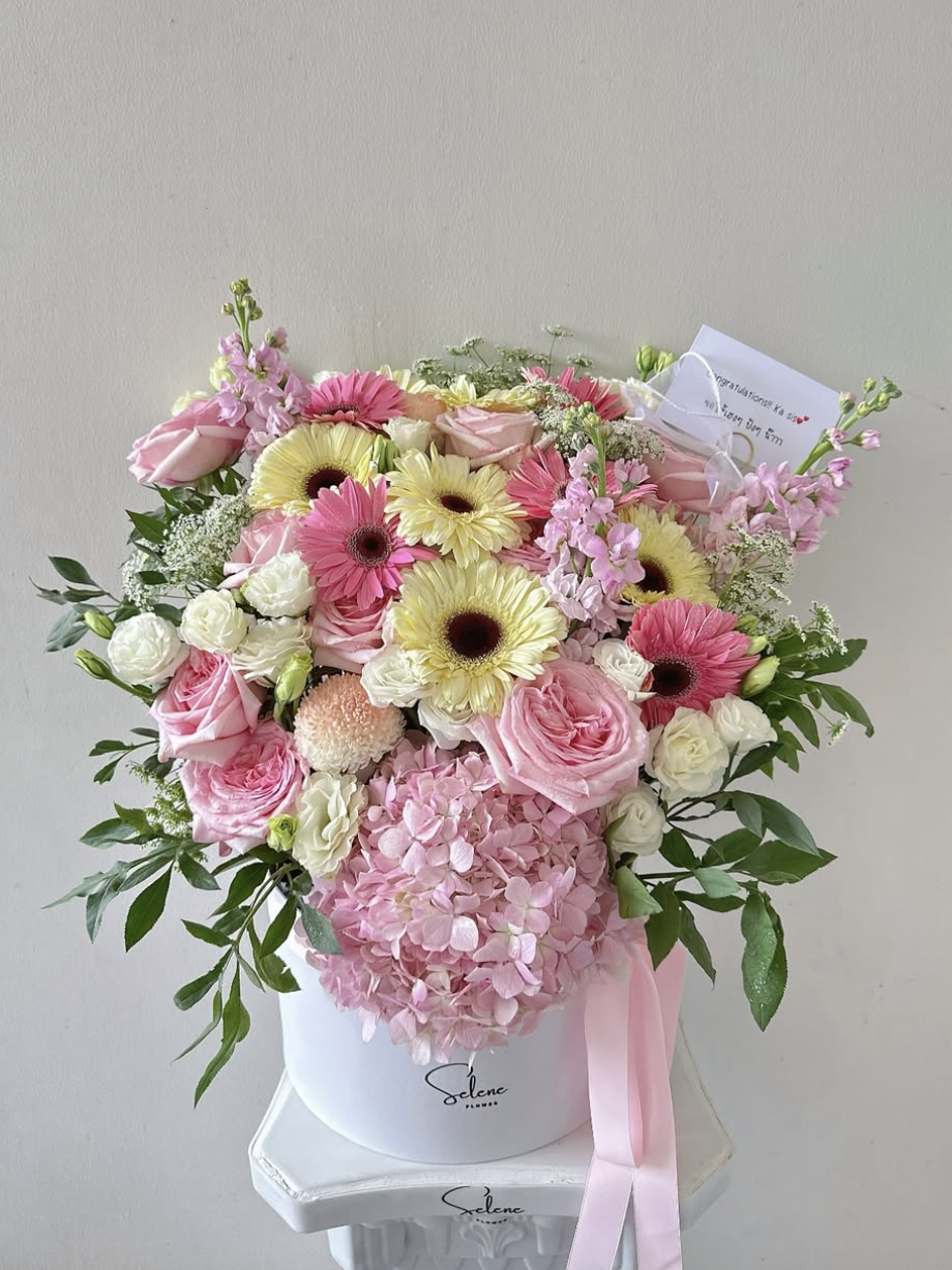 กล่องดอกไม้จัดแน่นในสไตล์หวานหรู รวมดอกไม้โทนชมพู-พาสเทล ที่คัดสรรมาอย่างพิถีพิถัน ไม่ว่าจะเป็นกุหลาบ เยอบีร่า ไฮเดรนเยีย และลิซิแอนทัส สื่อถึงความรัก ความร่าเริง และความห่วงใยที่ไม่ต้องพูดเป็นคำ